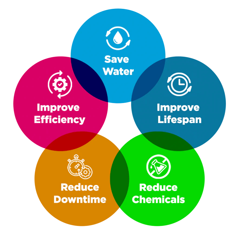 Scale on heat exchangers and cooling tower surfaces wastes energy and increases blow-down costs. HydroFLOW installs non-invasively to maintain heat transfer efficiency, reduce chemical use, and control biofilm and algae
